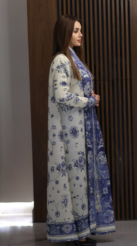 This sophisticated ivory abaya features an artistic royal blue print inspired by classic porcelain patterns. Designed for the modern woman who appreciates refined elegance, this piece blends timeless charm with contemporary style.